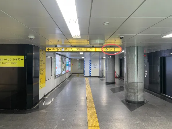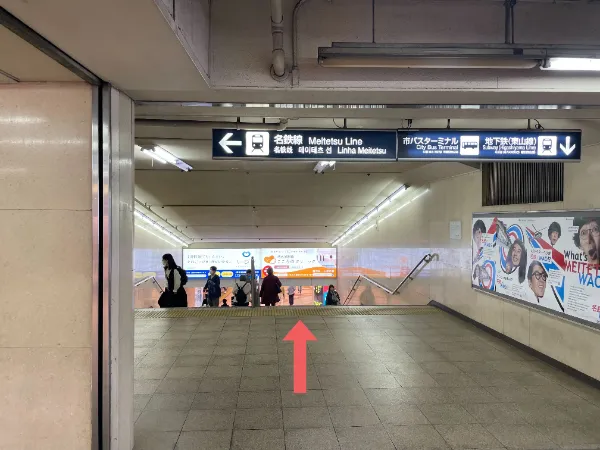 1. 名鉄地下改札を出て奥の階段へと進みます。