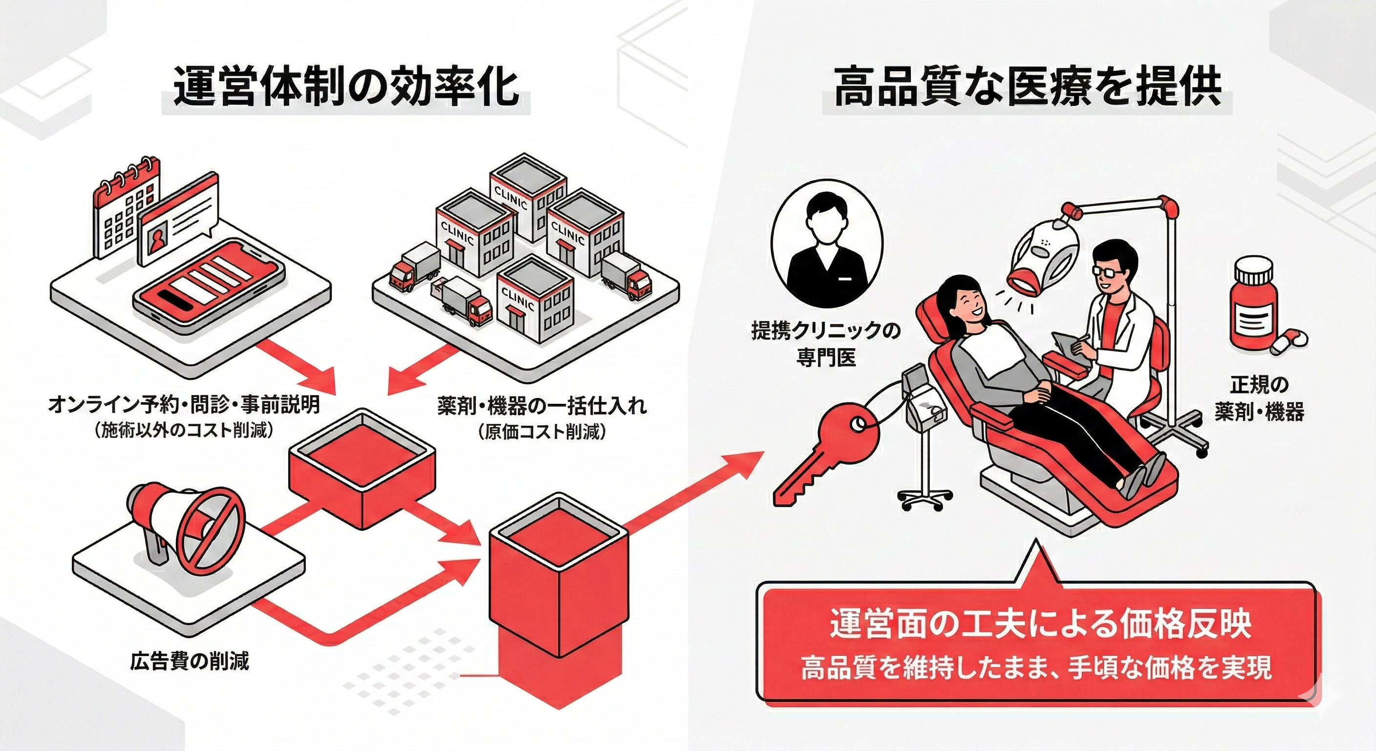 また、全国規模で提携クリニックを展開する体制により、薬剤や機器をまとめて仕入れることが可能です。これにより原価コストを抑えています。