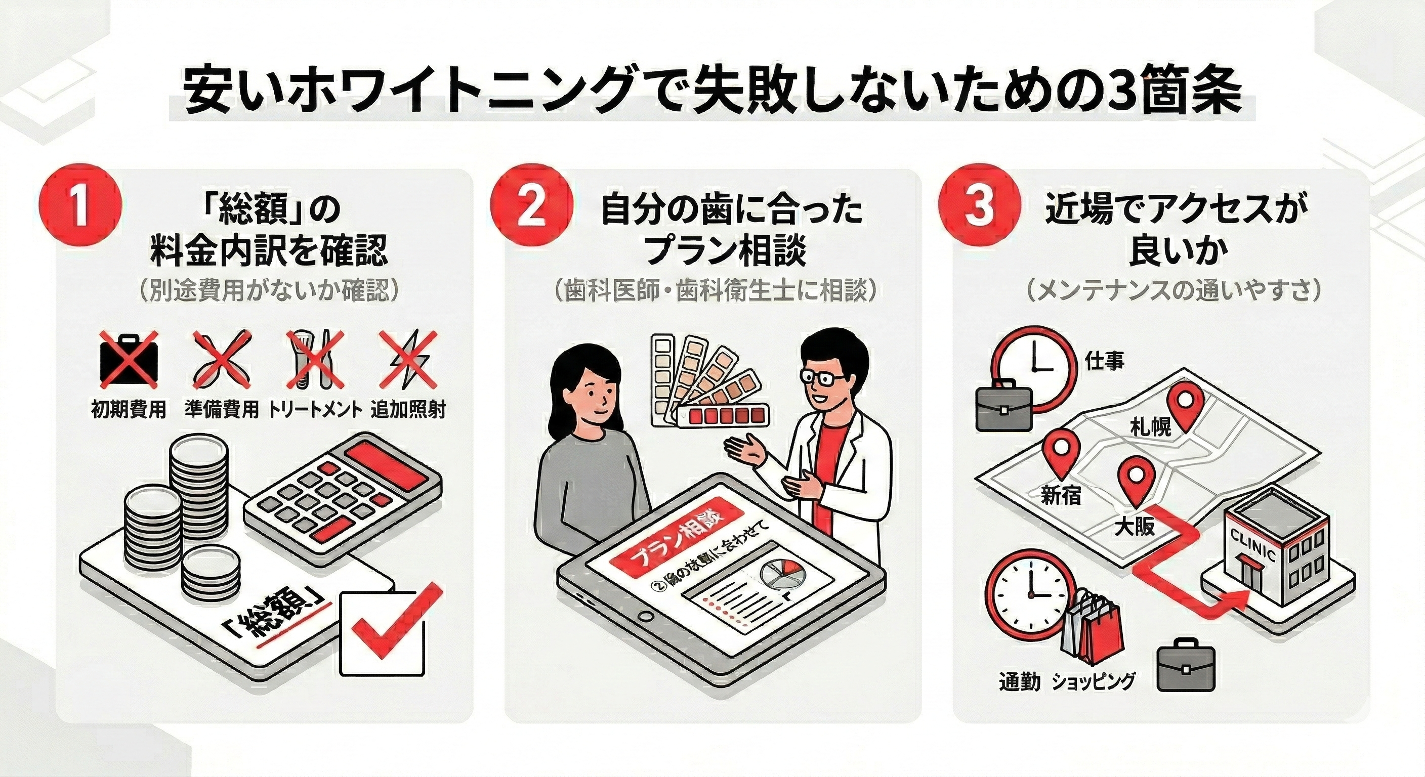ホワイトニングは「価格」だけで選ぶのではなく、目的に合った方法を選ぶことが重要です。