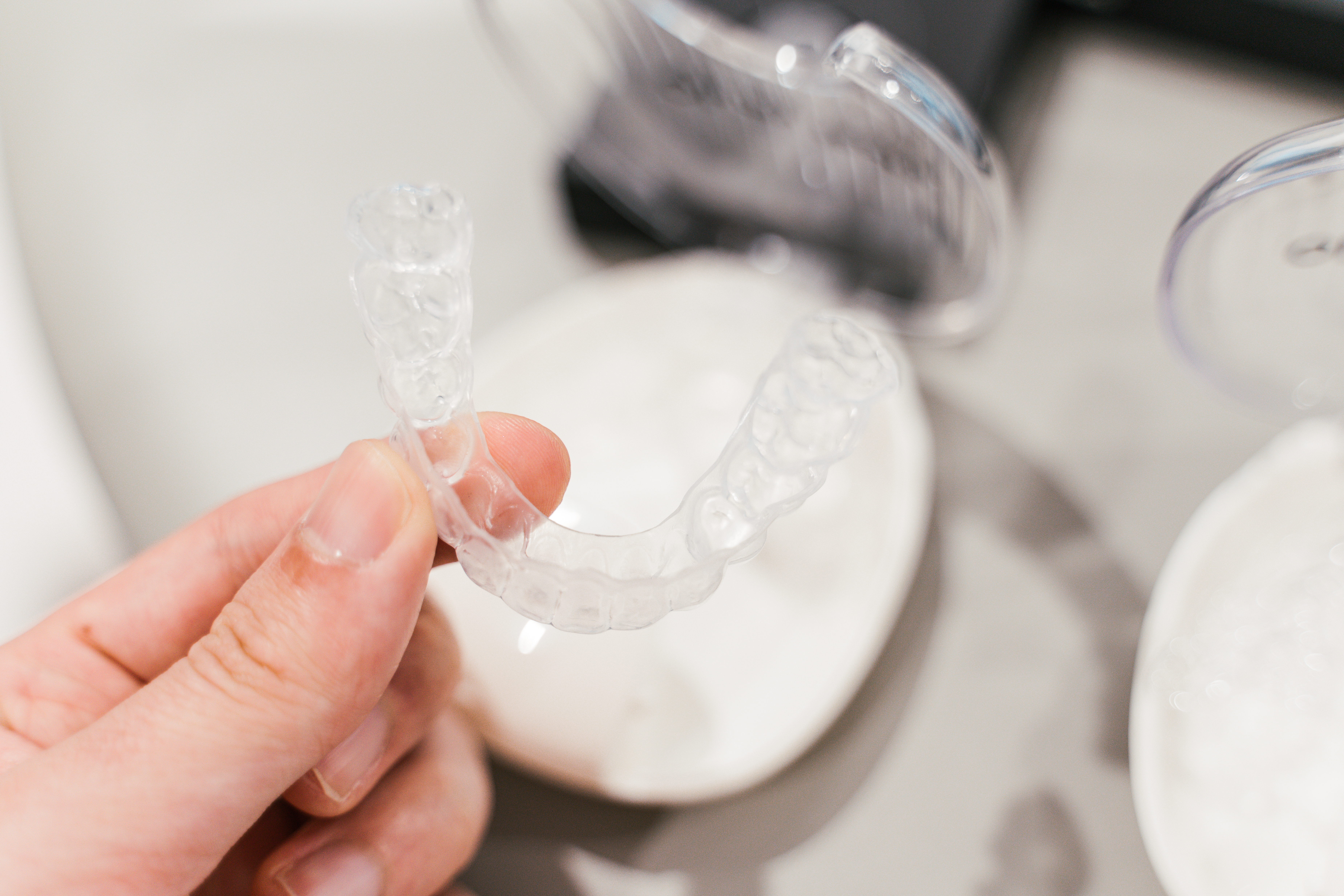 以下の写真のようにマウスピースには厚み(約0.5mm)があり、装着中は上下の歯の間に常にプラスチックが挟まっている状態です。
