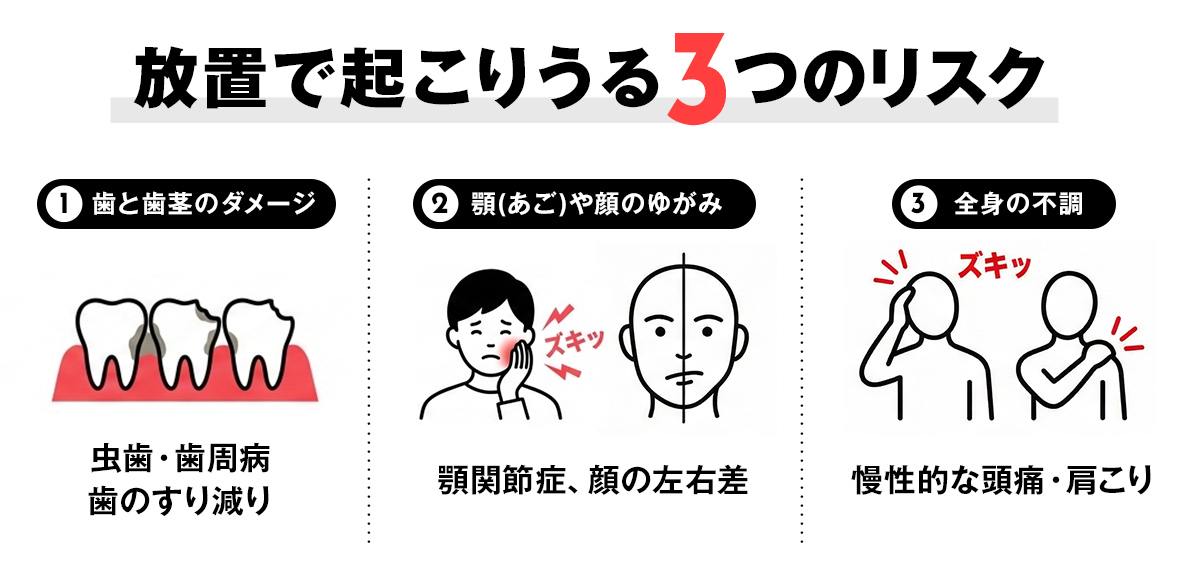 - 歯を失うリスク:歯磨きがしにくく虫歯・歯周病に歯が割れたりすり減ったりしやすくなります。