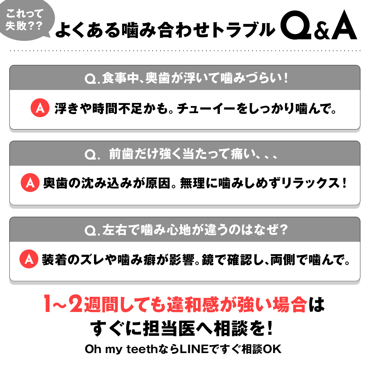 上記の対策を行っても1〜2週間以上違和感が続く、あるいは痛みが強くて食事ができない場合は、治療計画の修正(リファインメント)が必要な可能性があります。