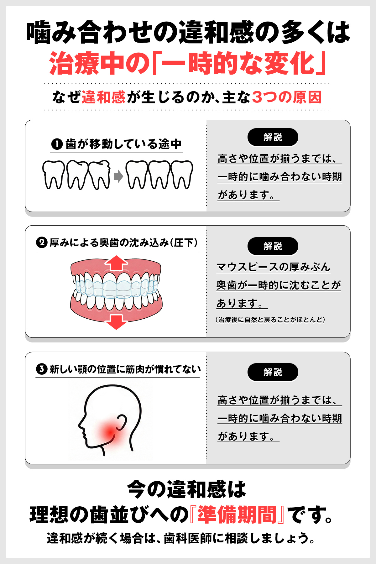 - 理由1:歯が移動する過程での一時的な「噛み合わせのズレ」