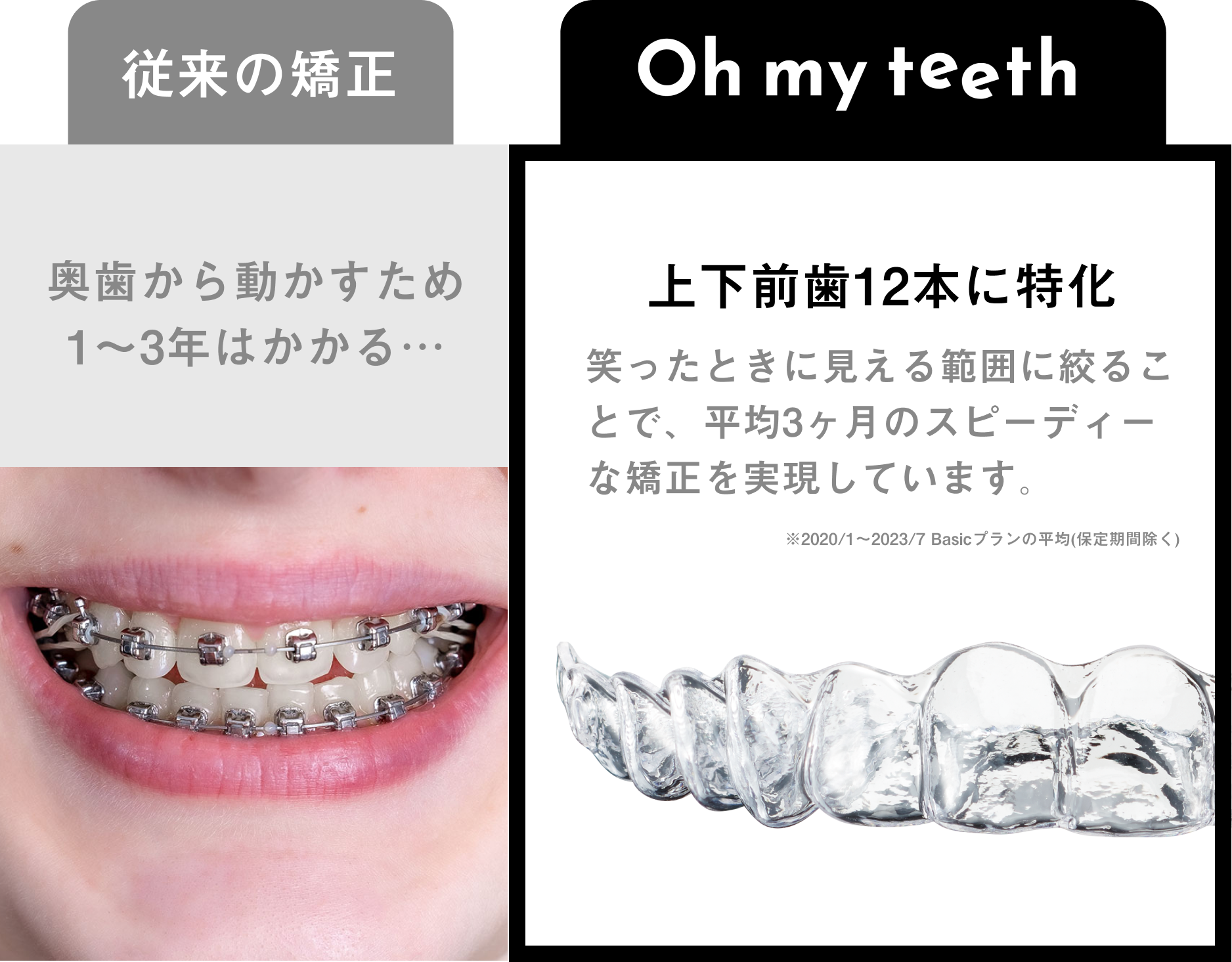 Oh my teethは以下の特徴により、出っ歯のスピーディーな改善にコミットします。