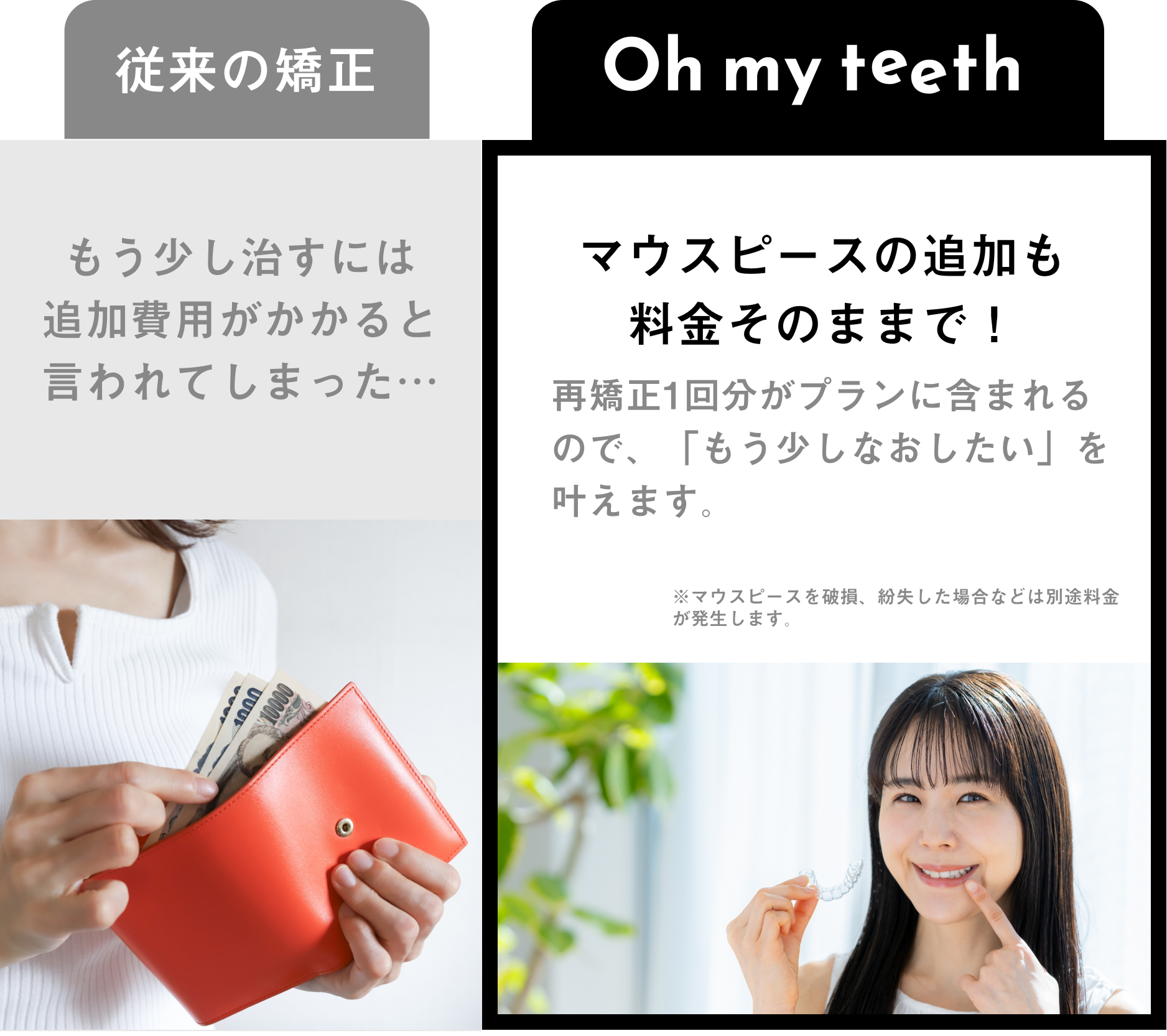 通常、再矯正には、再検査や治療計画の立て直し、マウスピースの製作費用が追加でかかりますが、Oh my teethではいただいておりません。