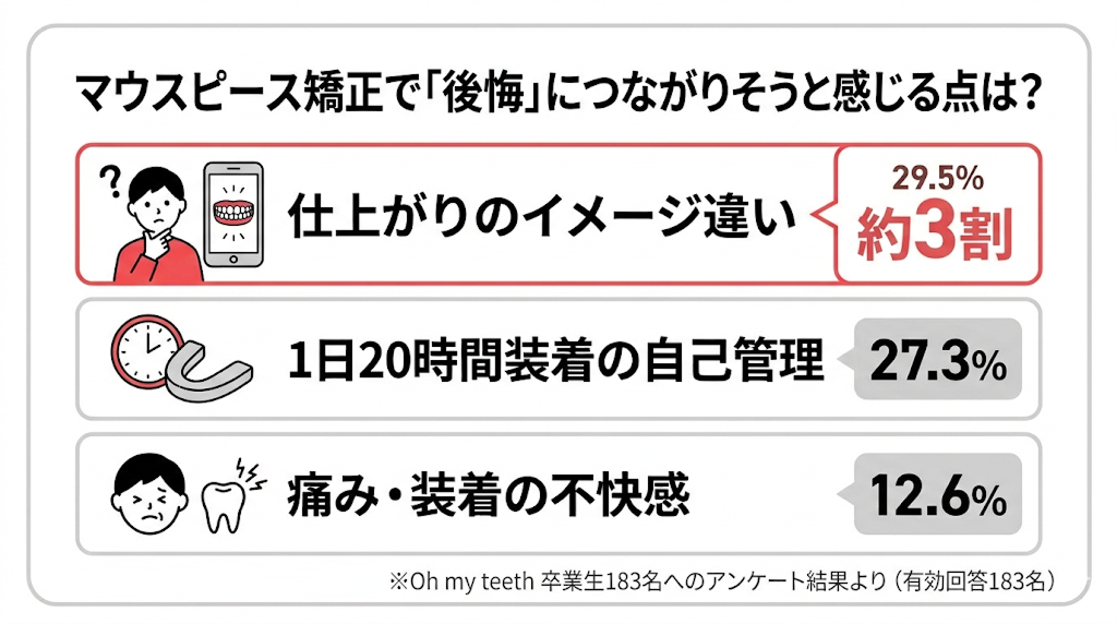 なぜなら、Oh my teeth経験者のアンケートで「 マウスピース矯正で後悔につながりそう」と感じた点を聞いたところ、「仕上がりのイメージ違い」が約3割でトップだったからです。