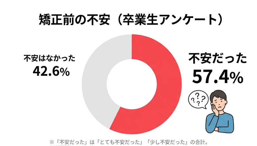 とはいえ、始める前に不安を感じるのはごく自然なことです。Oh my teeth経験者183名へのアンケートでも、約57%が矯正前に何らかの不安を感じていたと回答しています。