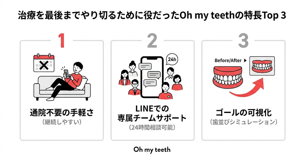 Oh my teethには、治療開始後に原則通院不要※で治療を進められることや、治療開始前に総額が決まる料金設計といった特徴があります。