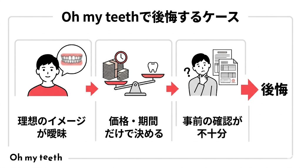 Oh my teethで「後悔した」と感じるケースの多くは、治療そのものに大きな問題があったというより、始める前の判断が十分に整理されていなかった場合に起こりやすい傾向があります。