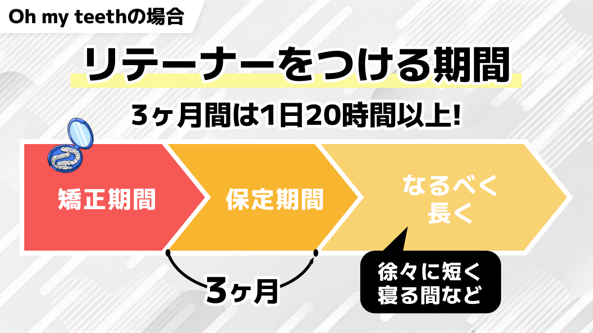 保定期間は矯正治療と同じくらいの時間が一般的。とはいえ、歯の状態やクリニックよっても保定期間は変わります。Oh my teethの保定期間は矯正終了後3ヶ月が目安です。その後は夜だけリテーナーを装着いただくようお願いしています。