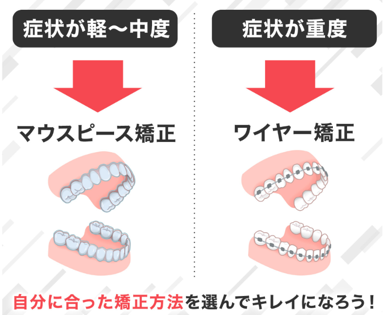 矯正方法は「マウスピース・ワイヤーのどっちがいいか」ではなく、「自分の症状にどれが使えるか」が先に決まるものです。