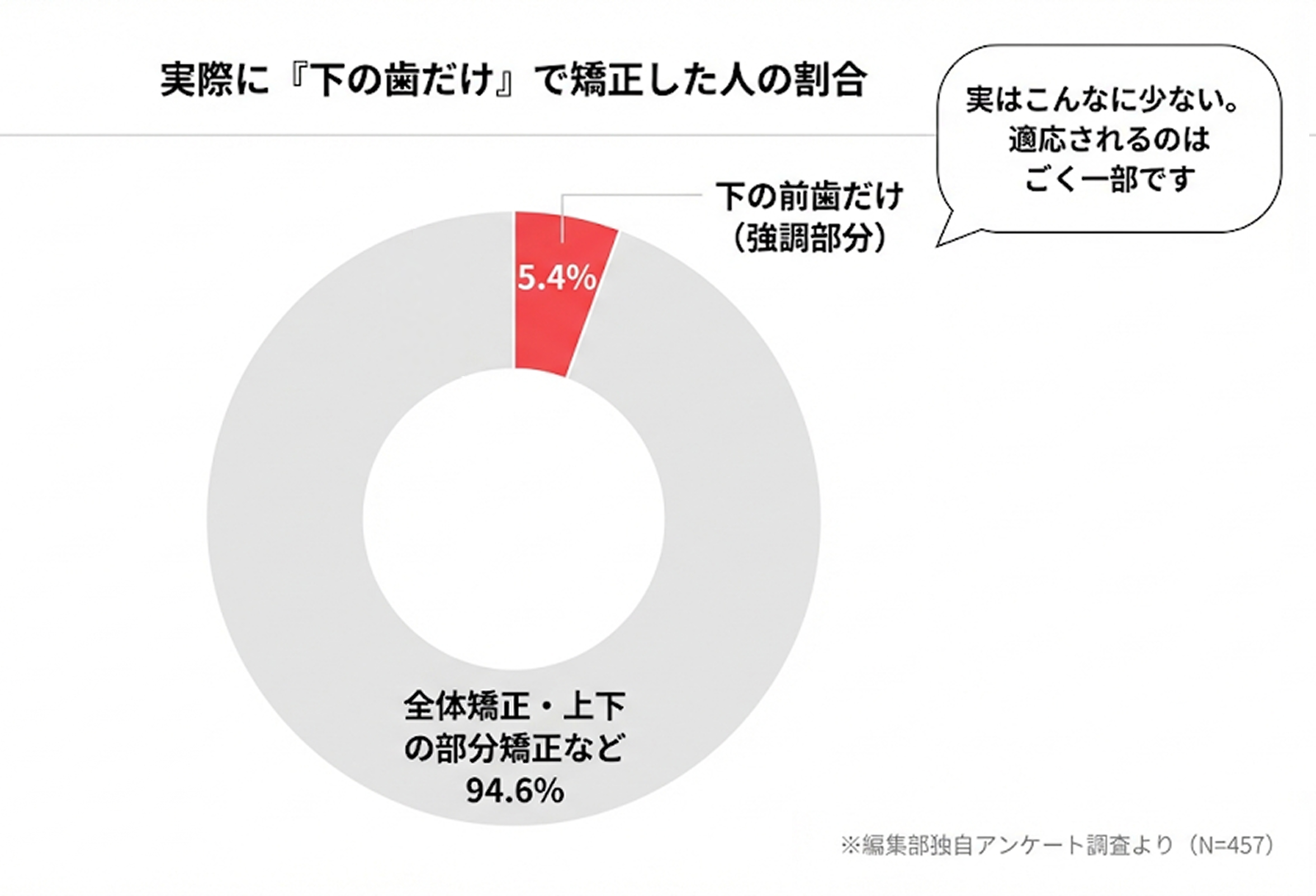 Oh my teethが矯正経験者457人に行ったアンケート調査によると、実際に「下の前歯だけ」で治療を完了した人は、わずか5.4%という結果になりました。