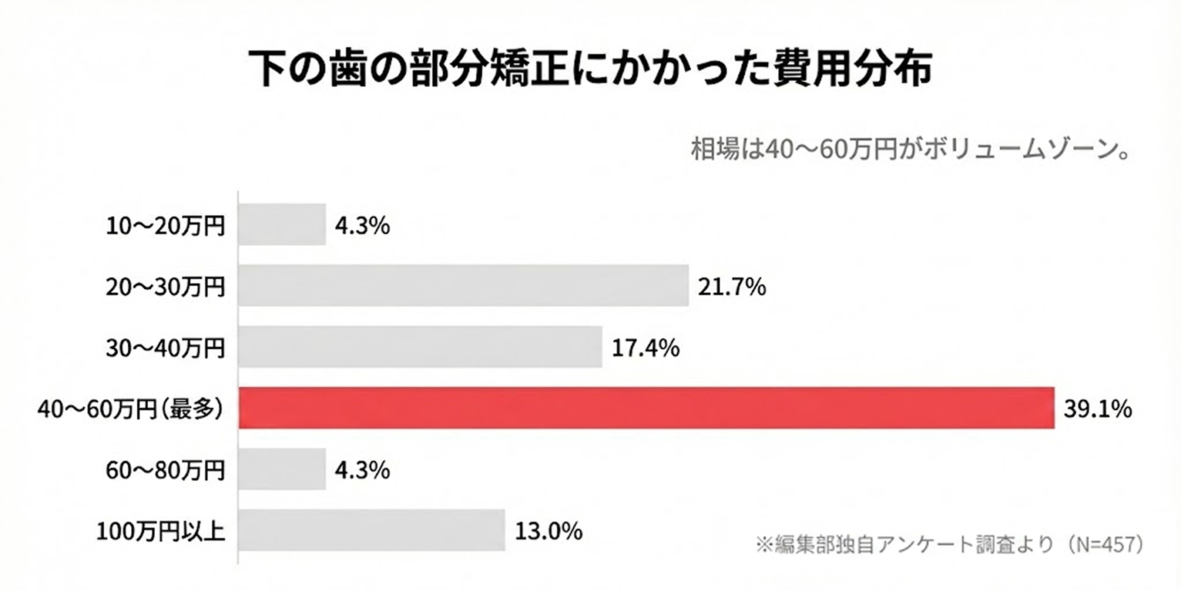 矯正経験者457人への独自調査の結果、実際に下の歯だけ(3本以上)を矯正した人の費用は、「40〜60万円」が最も多いことがわかりました。