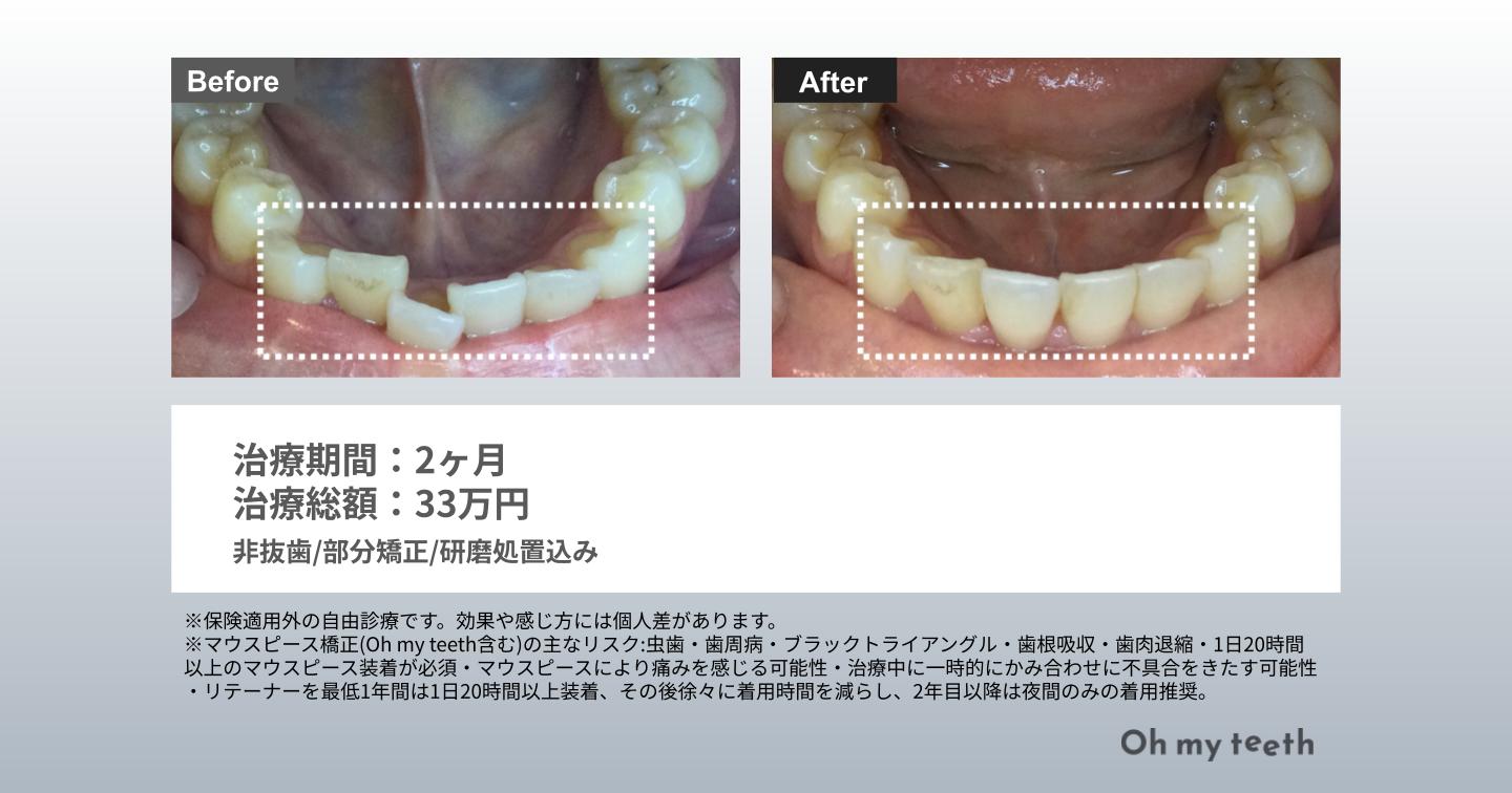 次に紹介するのは、マウスピース矯正「Oh my teeth」の部分矯正プランで下の歯のガタガタが改善した症例です。