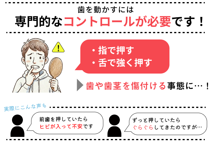 一方で、「指で押す」「舌で強く押す」といった自己流の方法は力の強さや方向が不安定であり、歯根や歯の神経、エナメル質を傷付けてしまうのです。歯にヒビが入る、歯ぐきが下がる原因にもなります。