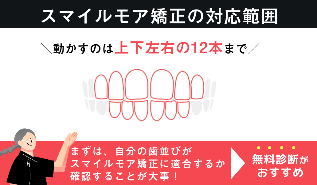スマイルモア矯正は、治療できる範囲が前歯12本に限られています。
