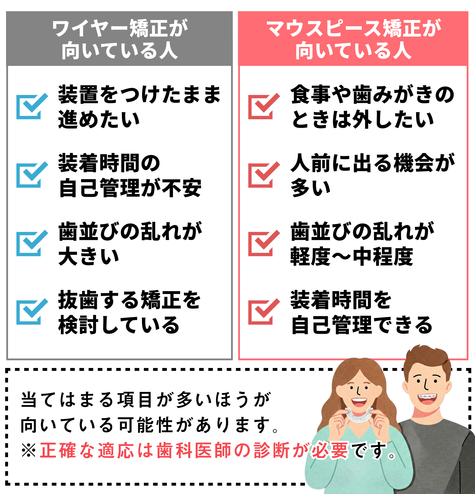 マウスピース矯正とワイヤー矯正は、どちらが優れているかではなく、自分の歯並びの状態に合うかで考えることが大切です。