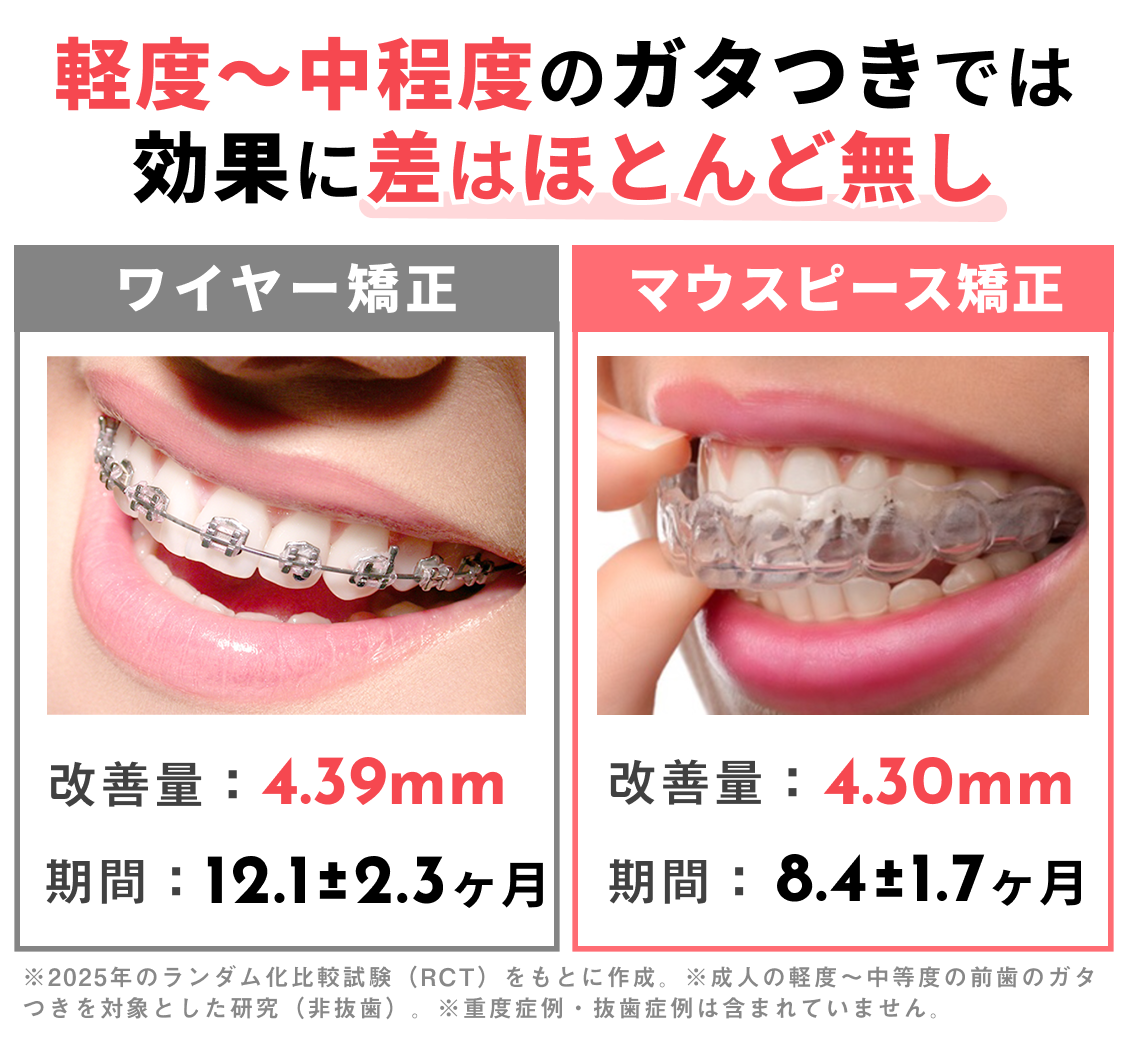 2025年に発表されたランダム化比較試験(※)では、成人の軽度〜中等度の前歯の叢生(ガタつき)を対象に、マウスピース矯正とワイヤー矯正の治療効果が比較されました。