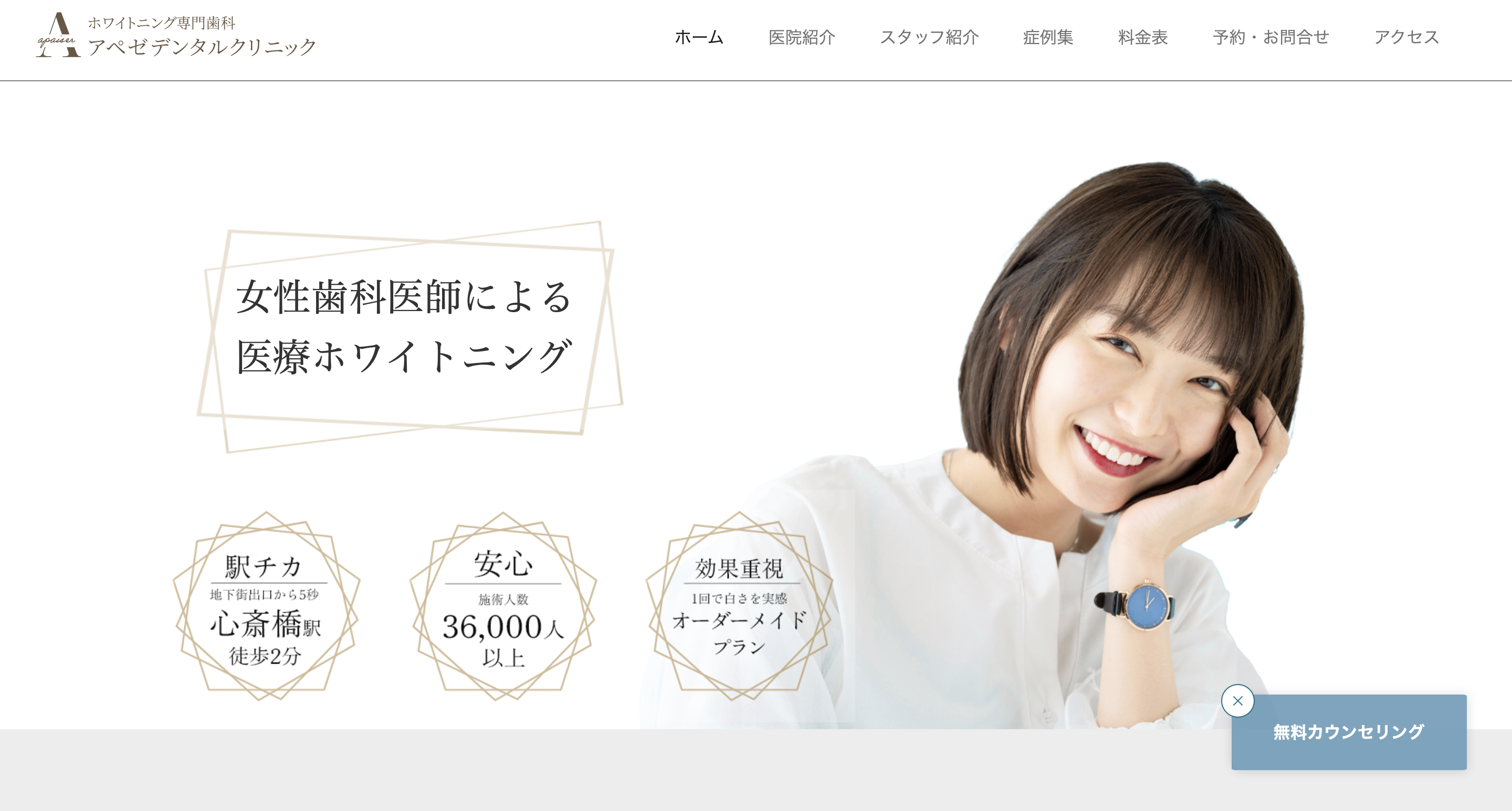 ホワイトニング専門歯科 アペゼデンタルクリニックは、心斎橋駅2番出口より徒歩2分にあるホワイトニング専門歯科です。