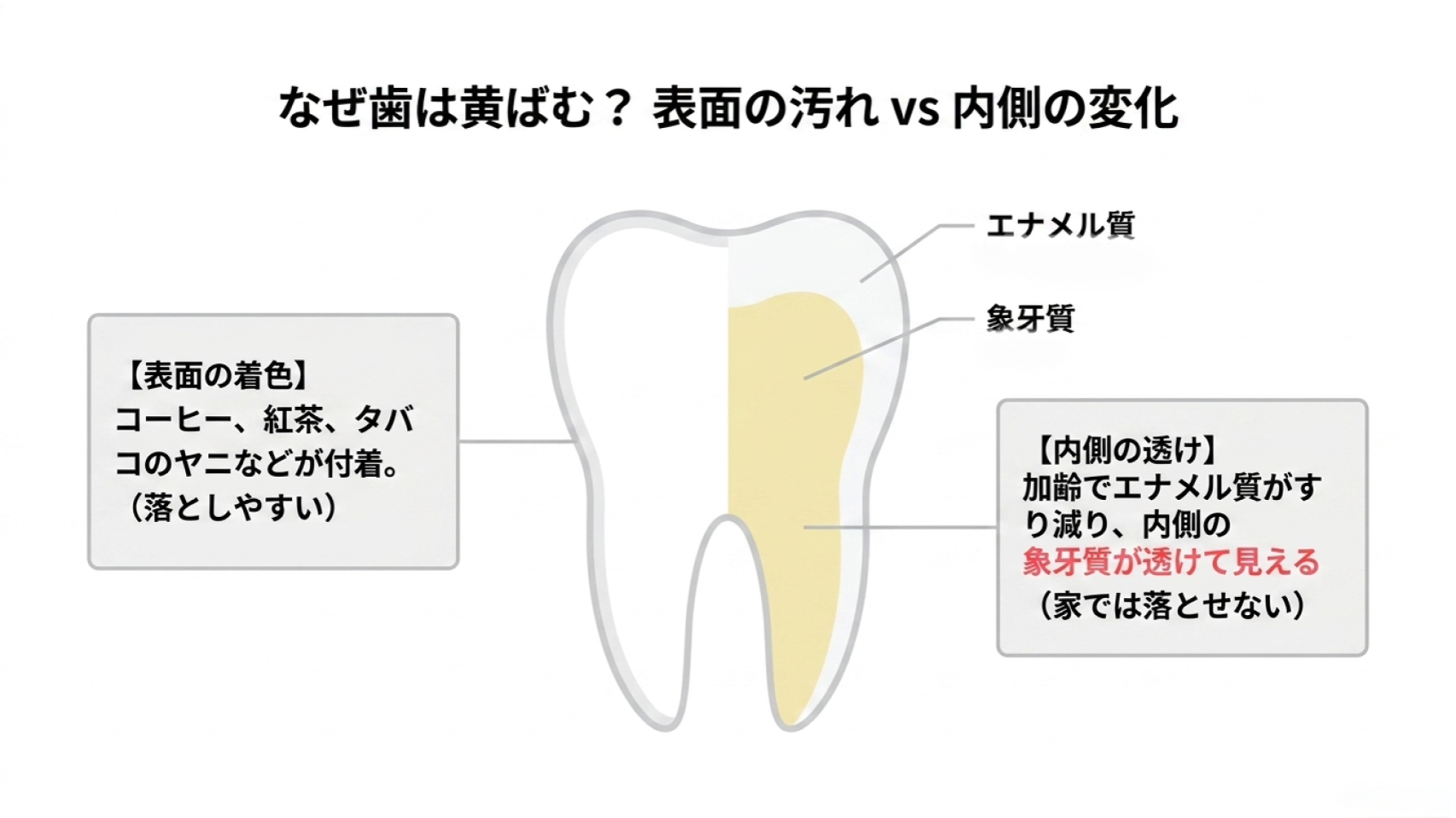 年齢を重ねると、歯の表面(エナメル質)が少しずつすり減り、内側の黄みがかった層(象牙質)の色が透けて見えやすくなります。
