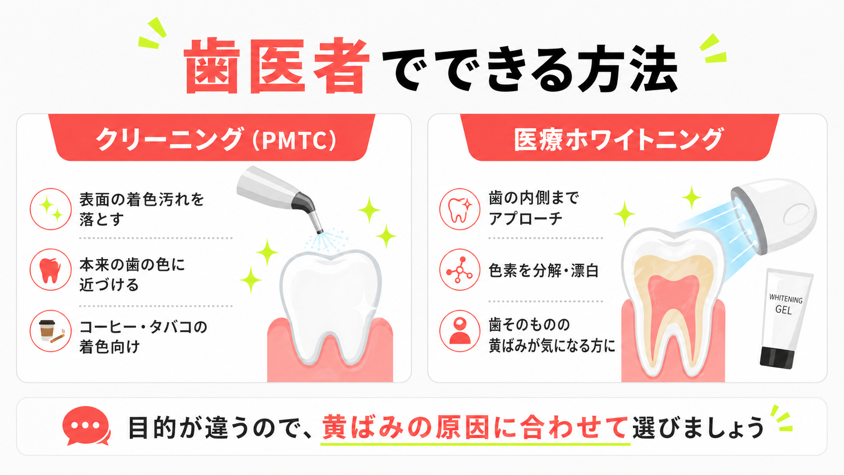 自宅ケアで対応しきれない黄ばみには、歯科医院での処置が選択肢になります。一言で「歯医者でできること」といっても、クリーニングと医療ホワイトニングでは目的も役割も異なります。