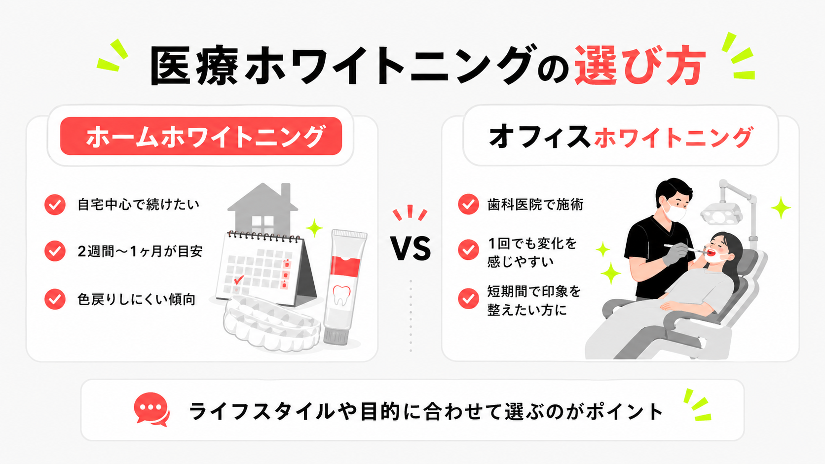 通院を抑えて自宅で続けたい方にはホームホワイトニング、短期間で印象を整えたい方にはオフィスホワイトニングが選ばれやすい傾向があります。