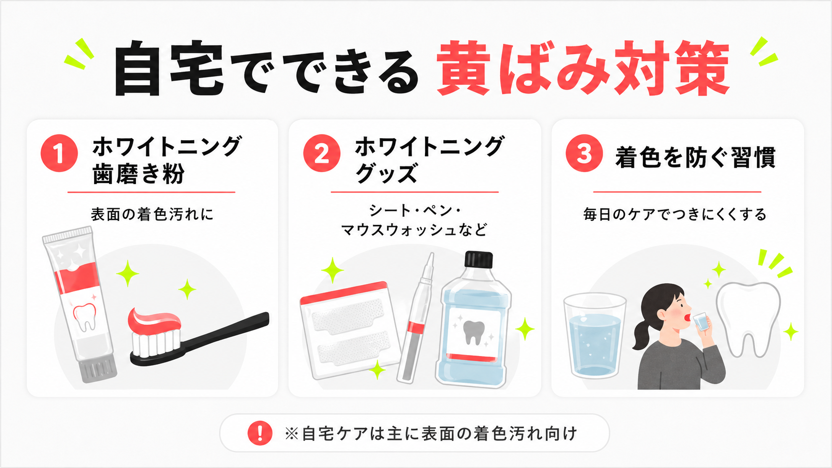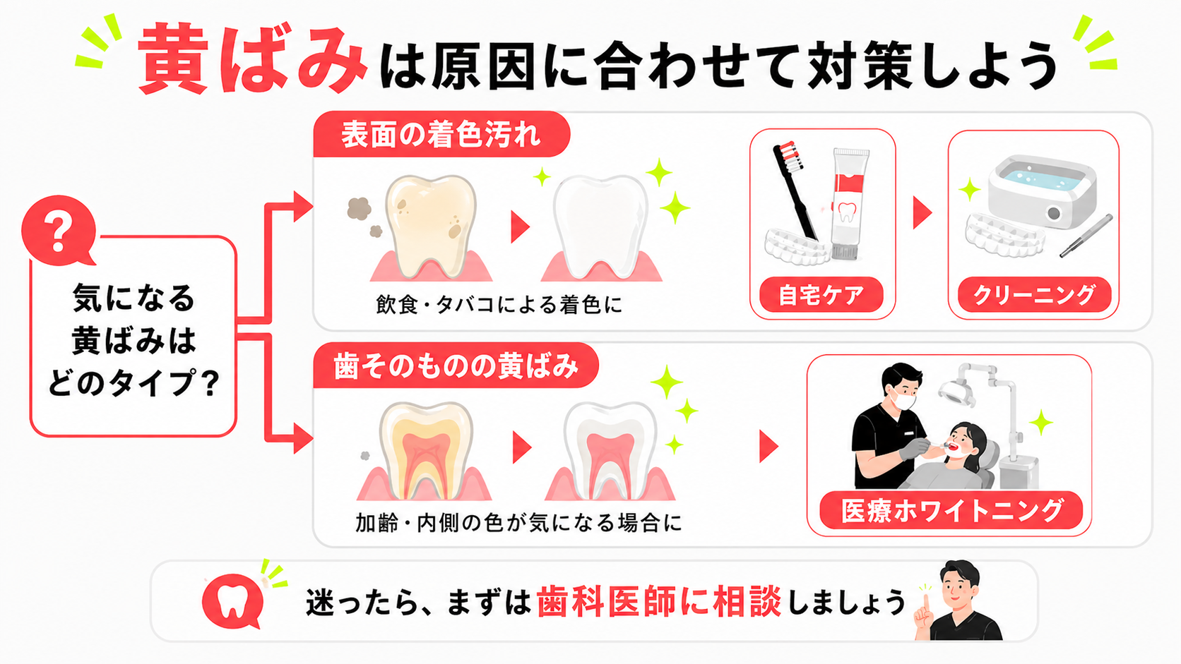 歯の黄ばみといっても、その原因はひとつではありません。原因によって、自宅ケアで対応しやすいものと、歯科医院での処置が向くものに分かれます。