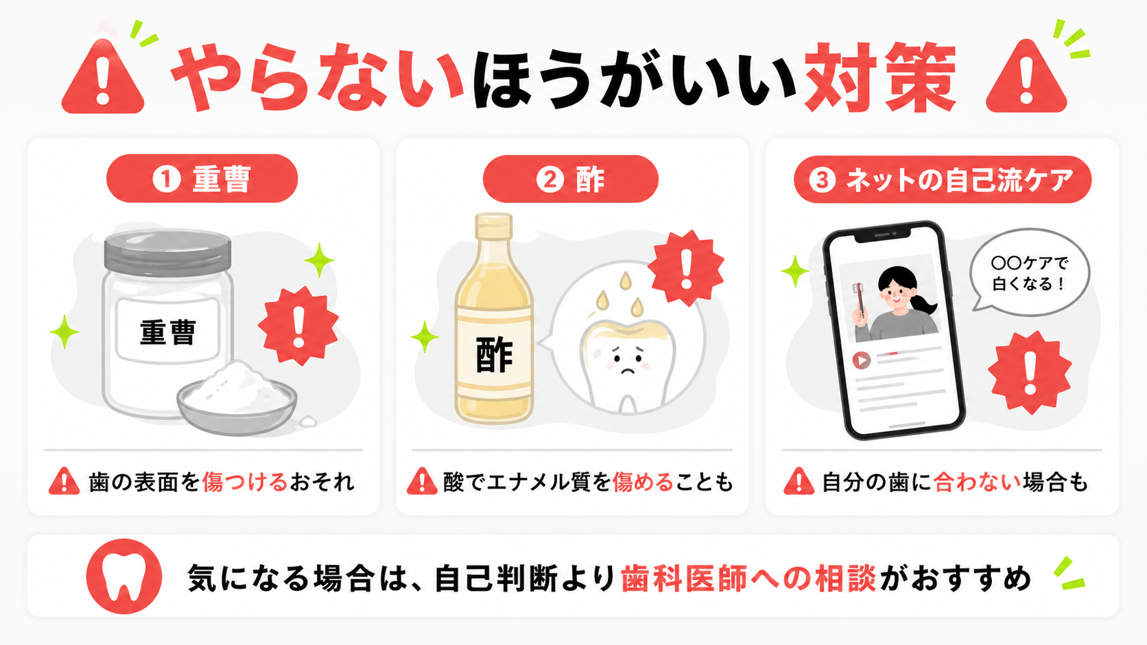 重曹・酢・家にあるもので試す方法など、ネットで話題になっている方法をそのまま試す前に、少し立ち止まって考えてみてください。口の中は、外から見えにくいぶん、気づかないうちに歯や歯ぐきに負担がかかっている場合があります。
