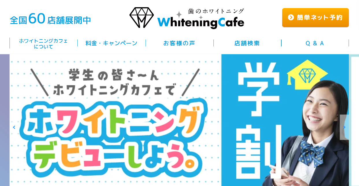 「ホワイトニングカフェ」は、全国60店舗展開のセルフホワイトニング専門サロン(2025年10月時点)です。